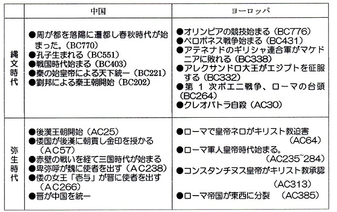 一方、この時代の外国の様子に目を転じて見れば、主なものは次の表のようになっていますが中国、ヨーロッパではすでに日本の縄文時代と同時期に多くの戦争が行われていたようで世界的に見ると人間の歴史が戦争の歴史の感があり日本でも遅ればせながら日本人の歴史としての戦争は弥生時代から始まったと言っても過言ではないと思われます。
