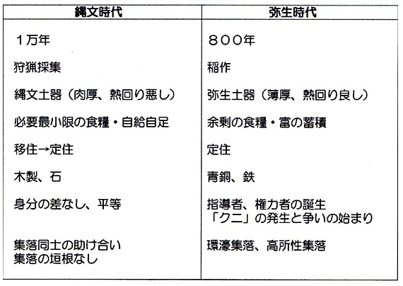 ここに自然とのつきあいの中で狩猟採集により必要な食料を必要なだけ収穫することで争いのない生活を基本としてきた縄文時代は終わりを告げることとなりましたが、その要因は一言で言えば大陸からの稲作の伝来であり、それに伴う富の蓄積から始まる地域差の発生と、その奪い合いの発生にあったと考えられます。