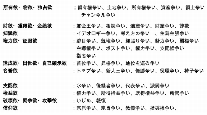 以上「マズローの欲求の5段階説」から、ある程度、欲求の本質と全体像が明確にされたと思われますが、この観点から「争いの要因」と「なぜ争いはなくならないか」について更に考えてみたいと思います。
